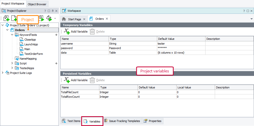 The Variables object provides access to a collection of project, project suite, or keyword test variables: